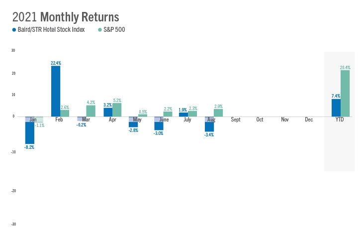 “Hotel stocks continued their streak of relative underperformance in August as investors remained focused on the impact of the Delta variant and the likely changes to post-Labor Day business travel trends,” said Michael Bellisario, senior hotel research analyst and director at Baird. “The near-term trajectory of the recovery has flattened; however, investors appear to have priced in near-term downside scenarios, in our opinion, and they continue to look to 2022 and 2023 when the broader travel environment should be more normal versus today.”