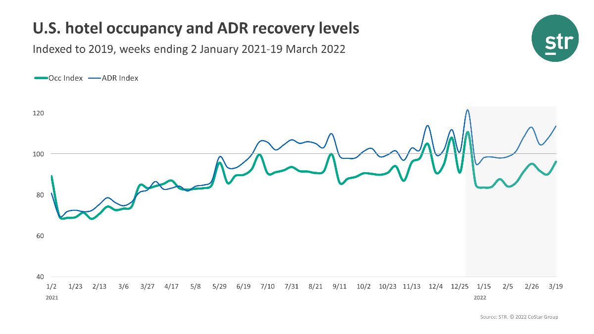 Occupancy was 66.9 percent for the week ending March 19, up from 63.2 percent the week before and down 3.7 percent for the same period in 2019. ADR was $151.63 for the week, up from $144.68 the week before and increased 13.6 percent from two years ago.